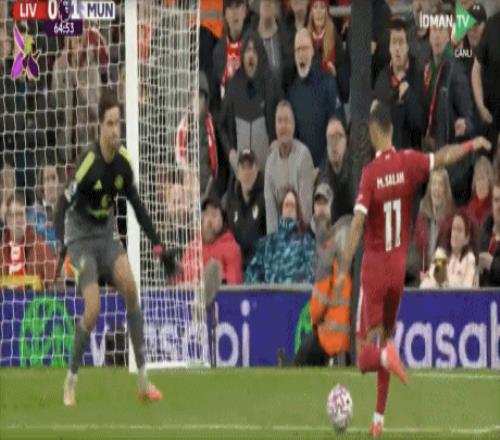 第65分钟,科尔克兹传中,萨拉赫禁区右侧无人盯防,左脚抽射竟然打偏。